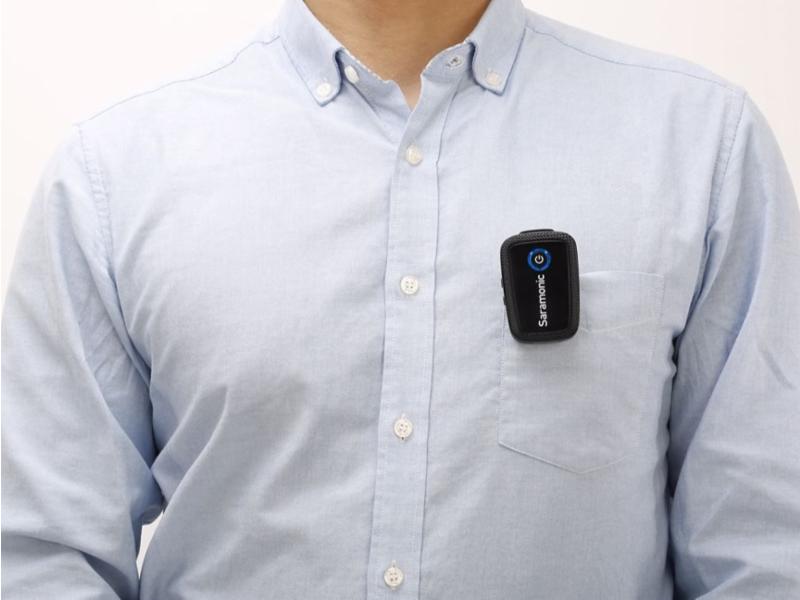 - Input source on transmitter: built-in microphone or the included external lavalier microphone