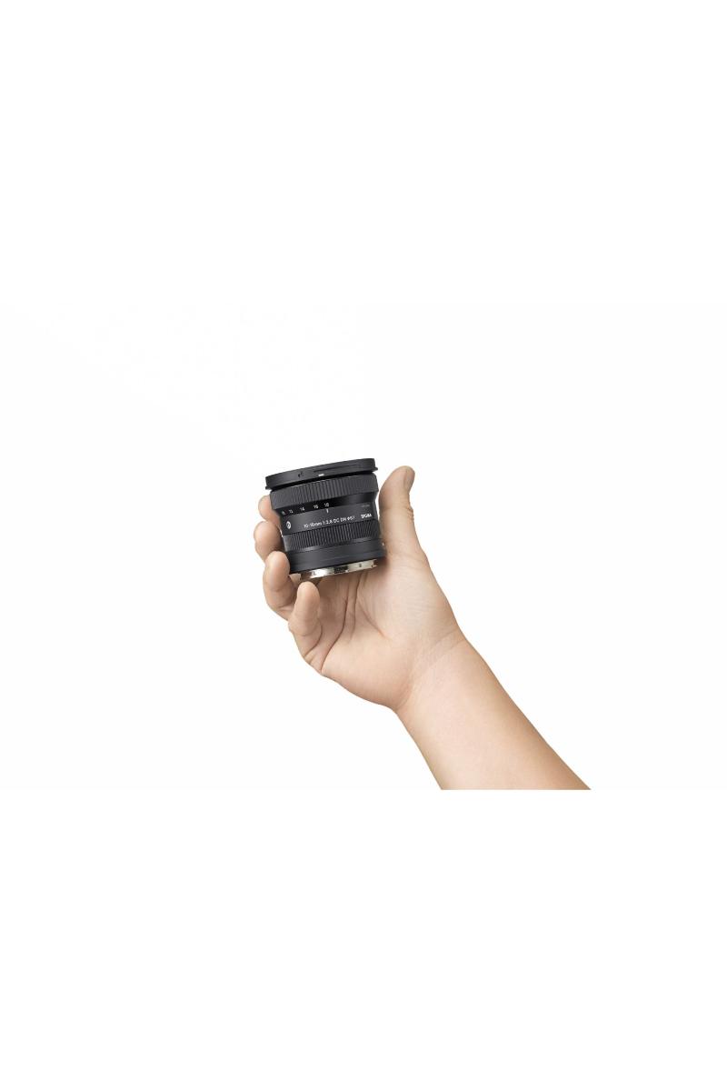 SIGMA 10-18mm F2.8 DC DN | Contemporary er verdens minste og letteste ultravidvinkel- zoomobjektiv for APS-C-kameraer*1, med en lengde på 62,0 mm, en maksimal diameter på ø72,2 mm og en vekt på 270 g*2. Objektivet kan enkelt bæres rundt eller festes til et APS-C speilløst kamera og en gimbal for å lage et ultrabærbart videooppsett.