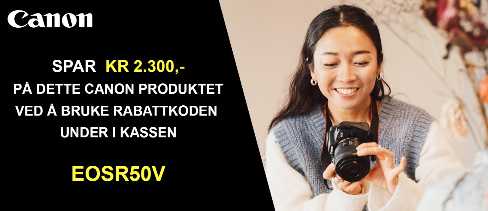 Med EOS R50 V kan innholdsskapere velge et objektiv som passer til deres prosjekt, enten de skal filme landskap til reiseblogger eller ta detaljerte nærbilder til demoer og veiledninger. De kan tilpasse det filmatiske uttrykket med bildestiler, fargefilter og funksjoner for opptak i sakte og rask film. EOS R50 V leverer kvalitetsopptak takket være avansert sensor på 24 MP og Canons intelligente autofokus Dual Pixel CMOS AF II. Kameraet tar opp 4k 60p1 og 4k 30p med 6K oversampling for ekstra detaljer. Ønsker du enda mer kreativ kontroll, gir Canon Log 3 presis fargegradering i etterproduksjonen, mens firekanals lyd gjør det mulig å ta opp flere lydkilder til intervjuer, podkaster eller oppsett med flere mikrofoner.
